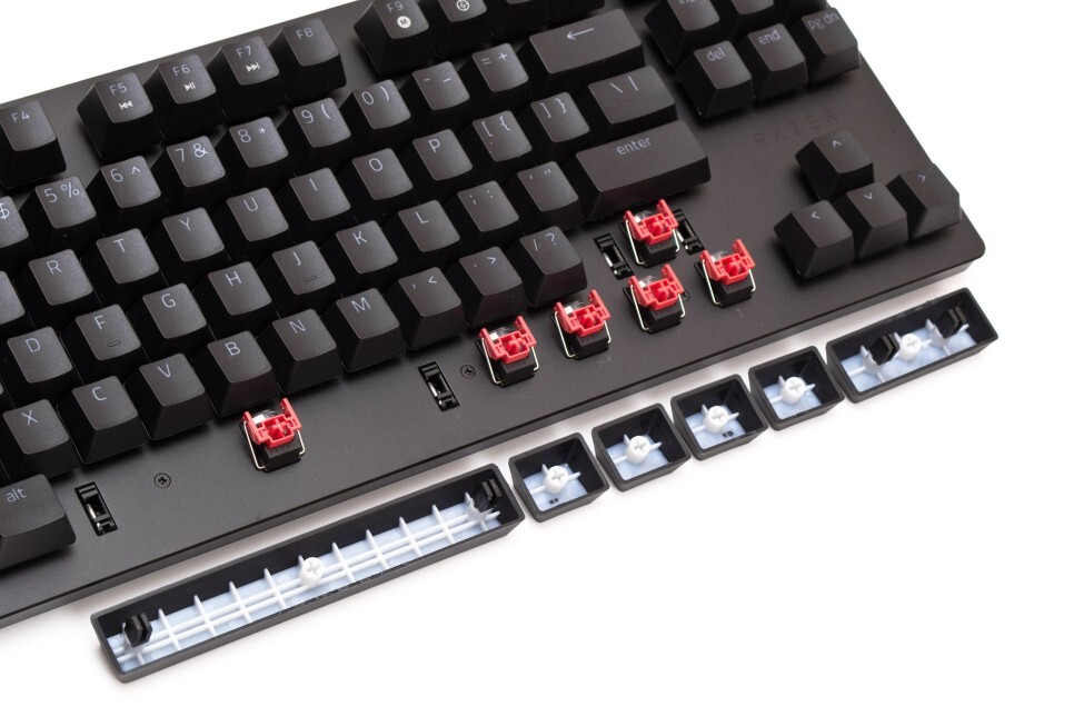 Razer Huntsman V2 TKL 광학 게임용 키보드는 Razer Huntsman TE의 첫 번째 버전에 비해 세 가지 주요 개선 사항이 있습니다. 먼저 컨트롤러 폴링 속도가 8000Hz로 증가했습니다. 사용자에게 눈에 띄는가? 아니요. 둘째, 편안한 팜 레스트입니다. 이것은 이미 훌륭합니다. 셋째, 본체 바닥에 댐핑 패드가 있습니다. 결과적으로 스위치는 훨씬 더 조용하고 더 즐겁습니다. 다른 모든 것은 변경되지 않았습니다. 그 결과 편안하고 촉각적으로 반응하며 조용하고 빠른 키보드가 탄생했습니다.
