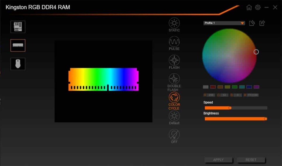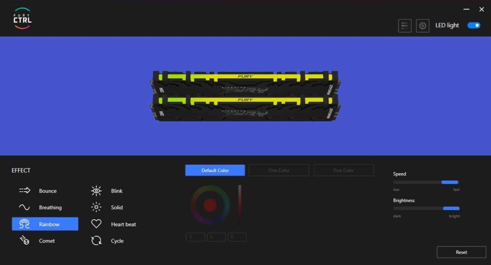 RGB 조명은 차분하고 깨끗하며 효율적이며 아름다운 색상 표현을 제공합니다. 8가지 조명 모드는 HyperX 소프트웨어를 통해 사용할 수 있습니다. 예, MSI Mystic Light Sync, Gigabyte RGB Fusion 2.0, ASUS AURA Sync 또는 ASRock Polychrome RGB와 같은 마더보드 제조업체의 독점 소프트웨어를 통해 조명 효과를 관리할 수 있습니다. 그러나 Kingston은 이 모든 것을 처리할 수 있는 자체 FURY CTRL 소프트웨어를 출시했습니다. 그리고 그것은 훌륭한 소식입니다.